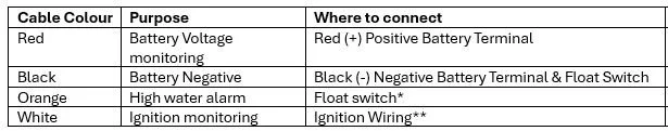 ** The white ignition monitoring cable must be connected to the ignition circuit that gives a voltage output when the engine is started (e.g. the accessory wire on the engine key).