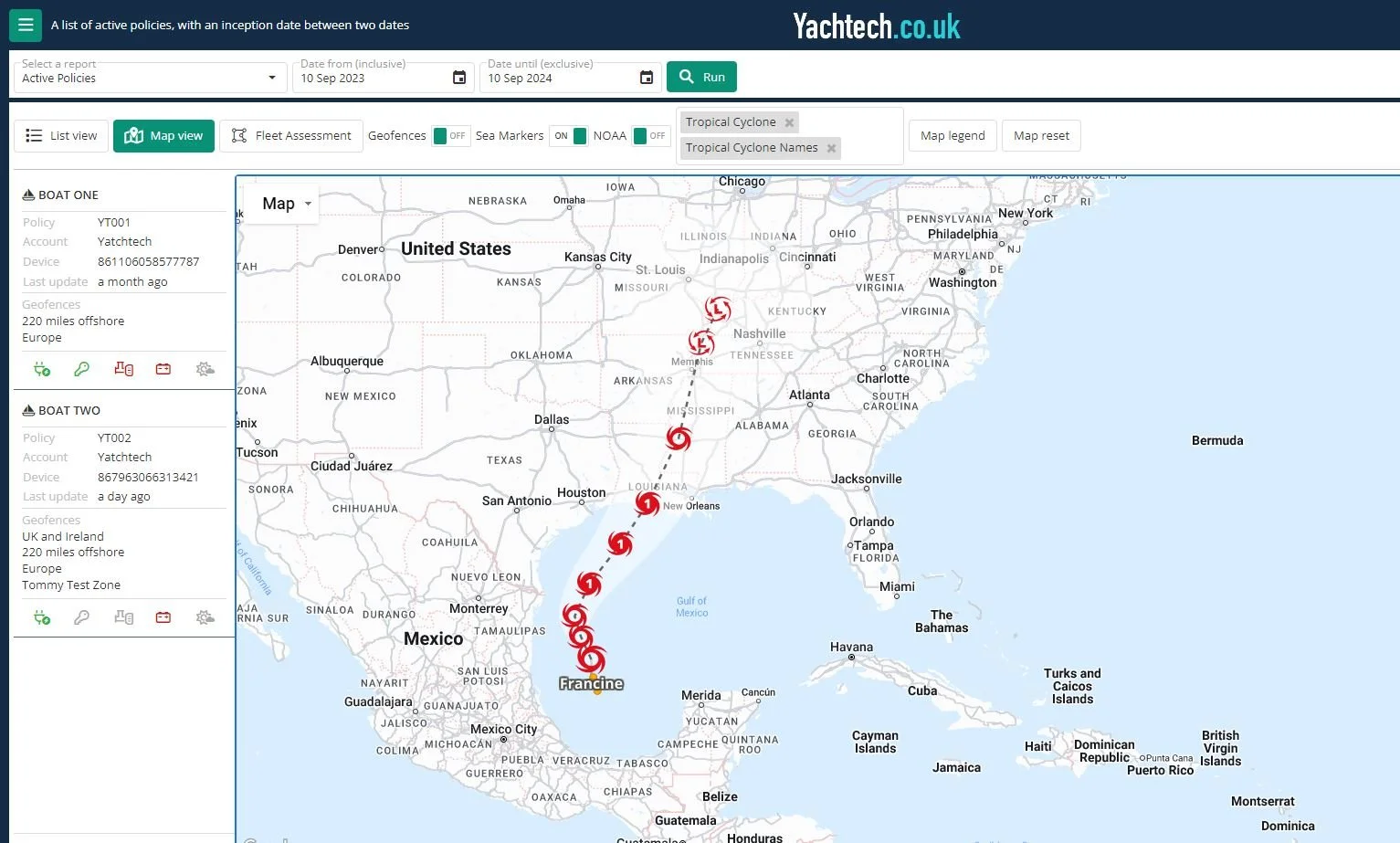 Advanced Storm Cell Tracking allows us to monitor the trajectory of incoming localised storms. These may bring severe rain, wind or hail with them, which could put yachts at risk. Yachtech tracks their trajectory and initiates an automated alerting system which sends emails and notifications to yacht owners to make them aware of any incoming storms with advice on how to protect their assets.